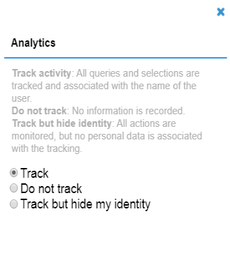 0 - Track activity(default): All queries and selections are tracked and associated with the name of the user.1- Do not track: No information is recorded.2- Track but hide identity: All actions are monitored, but no personal data is associated with the tracking. SeeUser Profile mappings.After you change the "