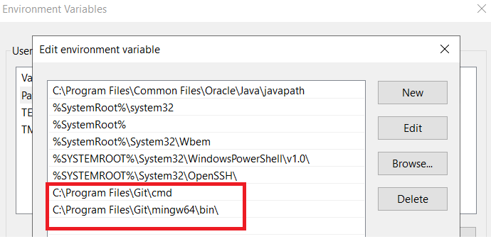 Under System variables, select the "Path" row, click Edit, New, and add two paths: