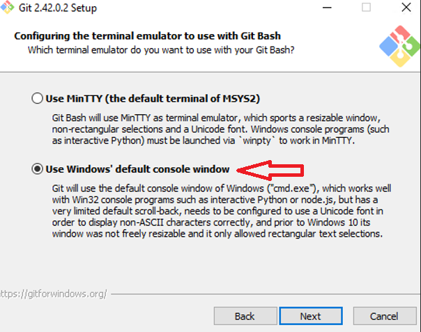 Press Next until you receive the window where you have this message: “Configuring the terminal emulator to use with Git Bash“