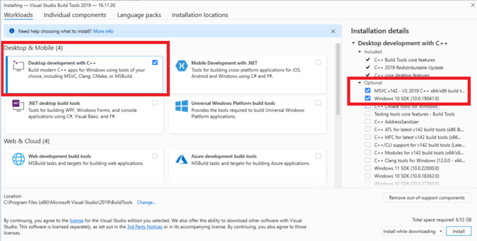 Choose MSVC v.142 – VS 2019 C++ x64/x86 build tools.
