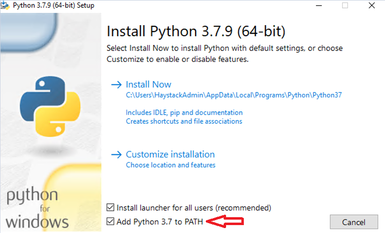 In Python installation windows, select the check-box “Add Python 3.7 to PATH“