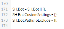6. Scroll down to line 172 (this may vary), which contains the text SH.Bot.CustomSettings