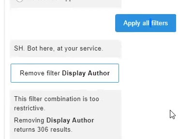 2. If there are no query results or the query text appears to be incorrect, but some filters are active, the Bot suggests removing some filters in order to obtain results: