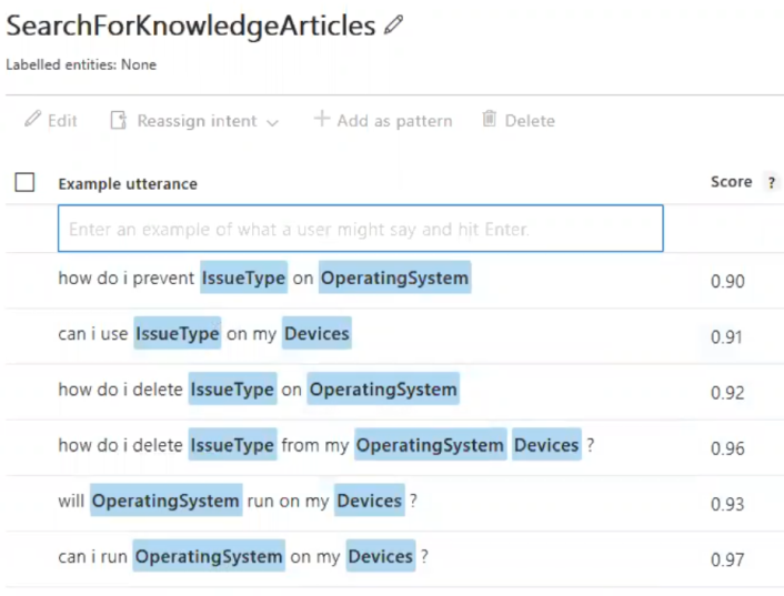 - In the example below, the intent "SearchForKnowledgeArticles" is shown.