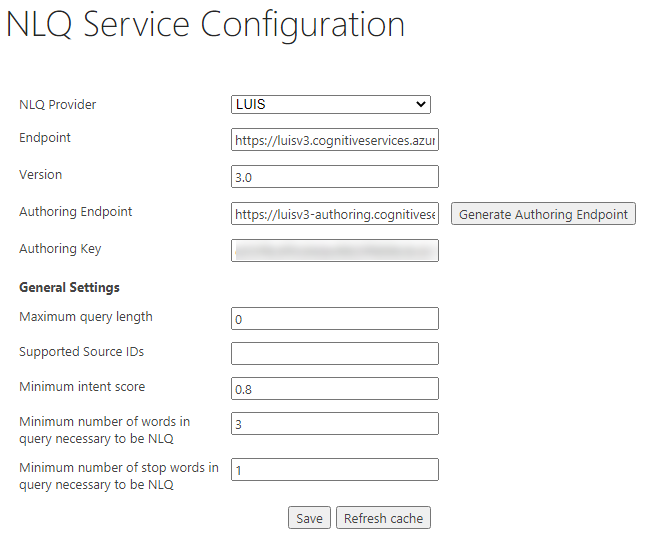 The NLQ Service Configuration page can be found by accessing the NLQ Service Settings page from the Administration page: