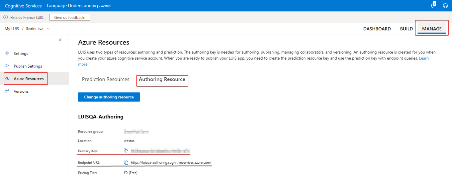 - The Authoring Key and Endpoint are shown in the screenshot below.