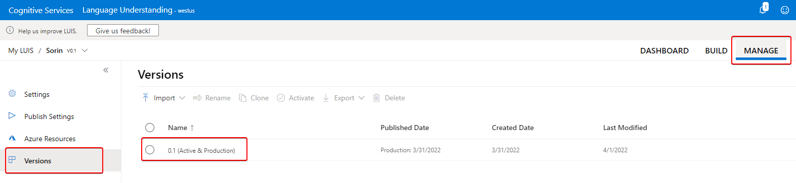 - The version can be found in Luis application under Manage → Versions