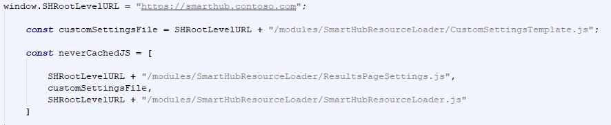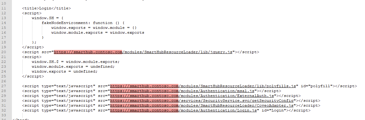 - Update the src attribute for all the script tags: prefix the path with the full address to your SmartHub site (https://yoursite.com) as shown in the example below, (which uses the sample site https://smarthub.contoso.com):