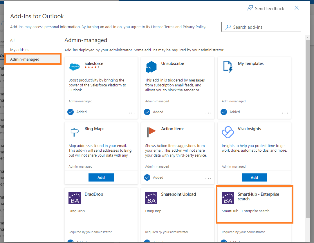- Locate the SmartHub - Enterprise search app, and click Add.