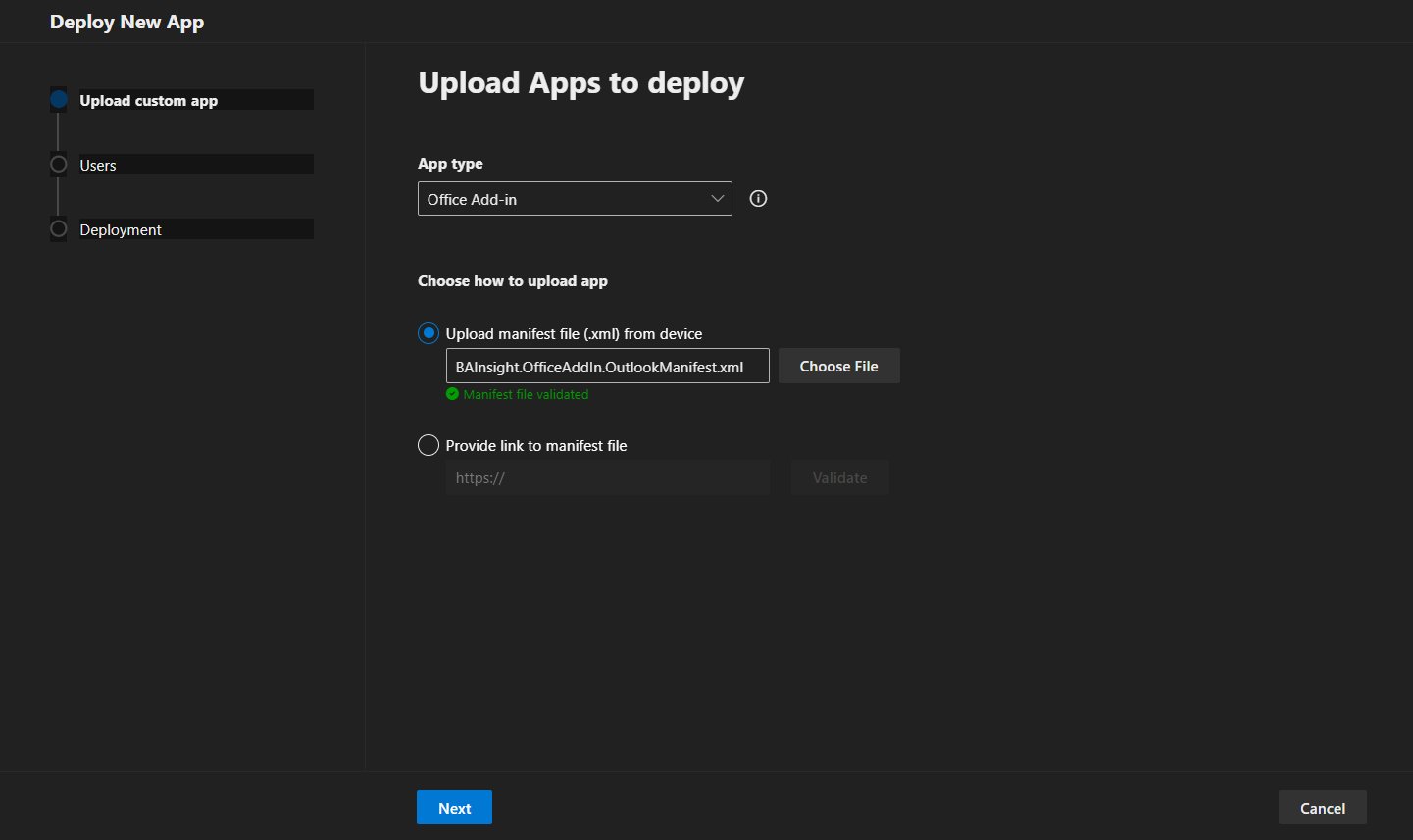 - In the Choose how to upload app field, select Upload manifest file (.xml) from device.