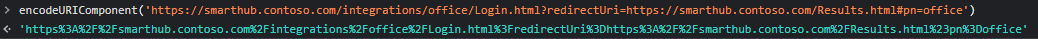 Action: "return window.location = 'https://smarthub.contoso.com/integrations/office/Login.html?redirectUri=https%3A%2F%2Fsmarthub.contoso.com%2FResults.html%23pn%3Doffice'",