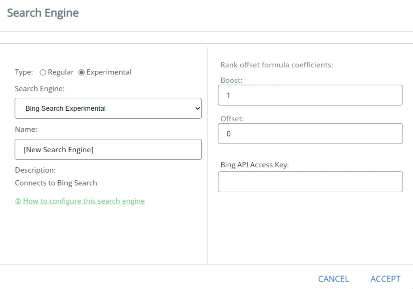 Use the following instructions to add the Bing Search Experimental search engine to SmartHub: