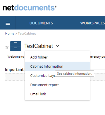 - In NetDocuments, open a cabinet that will be indexed by the BA Insight NetDocuments search engine and searched by users.