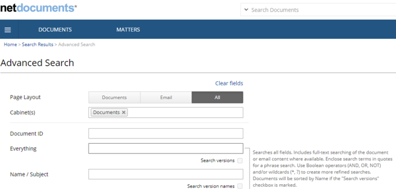 - Make sure you have a Search Versions checkbox under the Everything field on the Advanced Search window in the NetDocuments search portal.