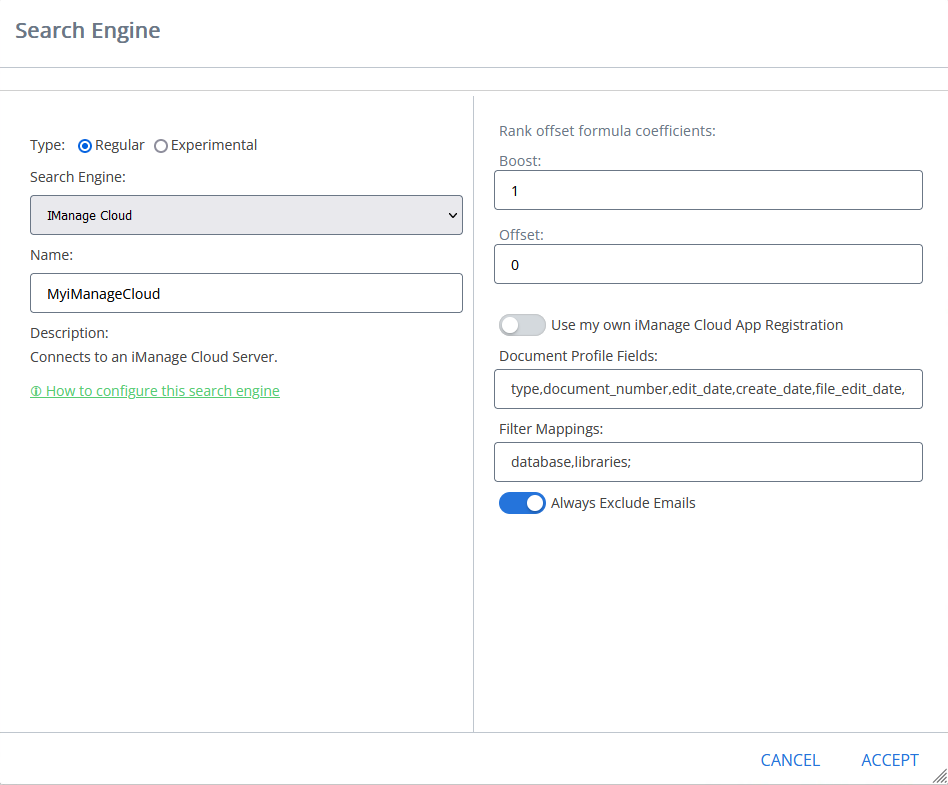 - Add New Search Engine: Click the "Add New Search Engine" link to add your new iManage search engine.