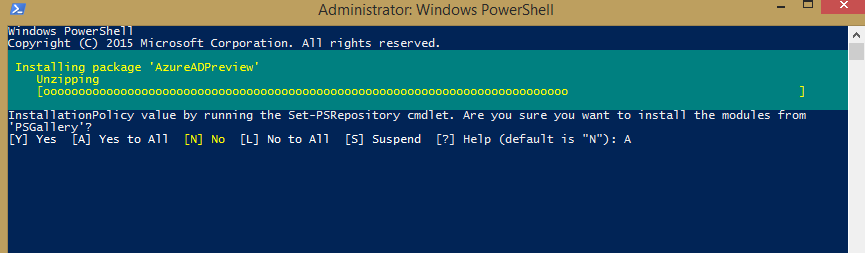 2. Install the AzureAdPreviewModule with the command Install-Module -Name AzureADPreview as shown below: