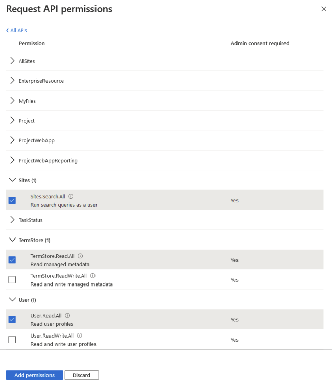 3. TermStore.Read.All (Optional. Needed only for the SharePoint Online search engine)