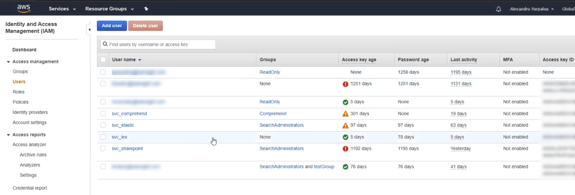 - To set the security access for each IAM user account, from console.aws.amazon.com, navigate to IAM > Users > <user_account> > Security Credentials.