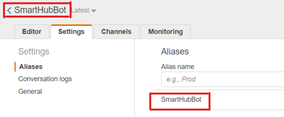 - The Bot Name and Bot Alias are shown in the screenshot below: