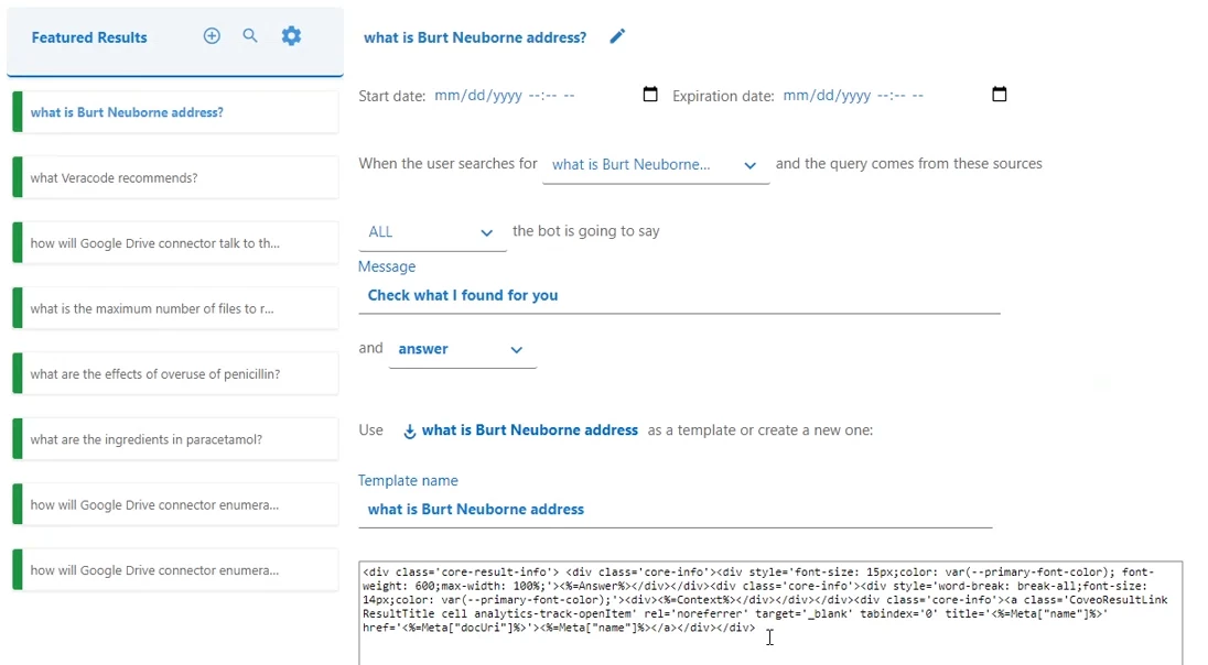 - If you configure Featured Results instead of NLQ Q&A, an exact search query must be entered instead of an intent phrase.