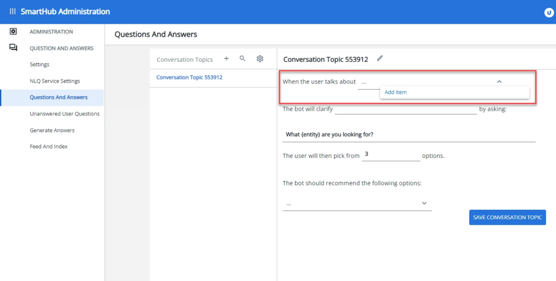 - Add and configure a new Conversation Topic or NLQ Q&A.