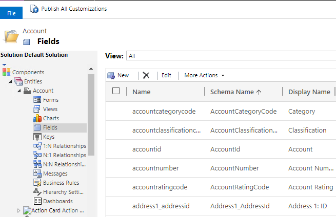 - Expand the desired entity, click on Fields to see all properties for an entity.