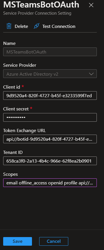 • TeamsBotConnectionName with connection name that you noted.