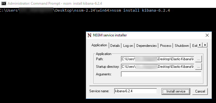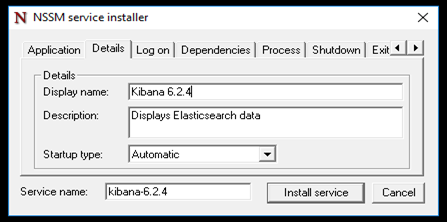 nssm install kibana-7.0.0In the "NSSM service installer" window: