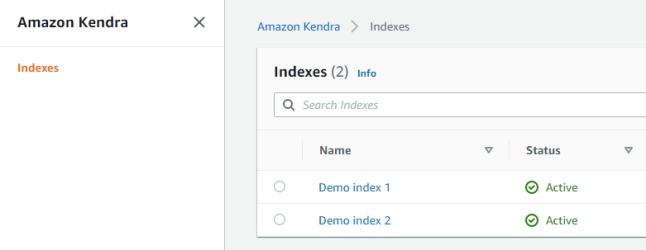 - Index name: The name of the AWS Kendra index to be used at search time. This name is located in the Kendra management page.