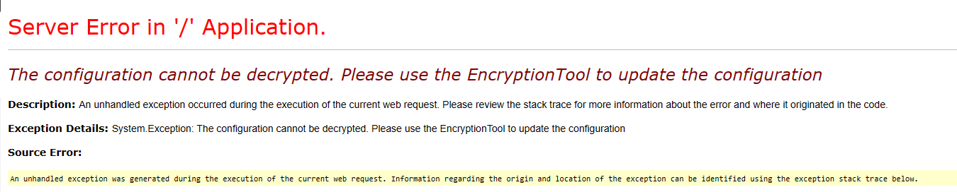 The following errors indicate that the configurations have not been upgraded. See How to use the SmartHub Encryption Tool to change the encryption keys, above.