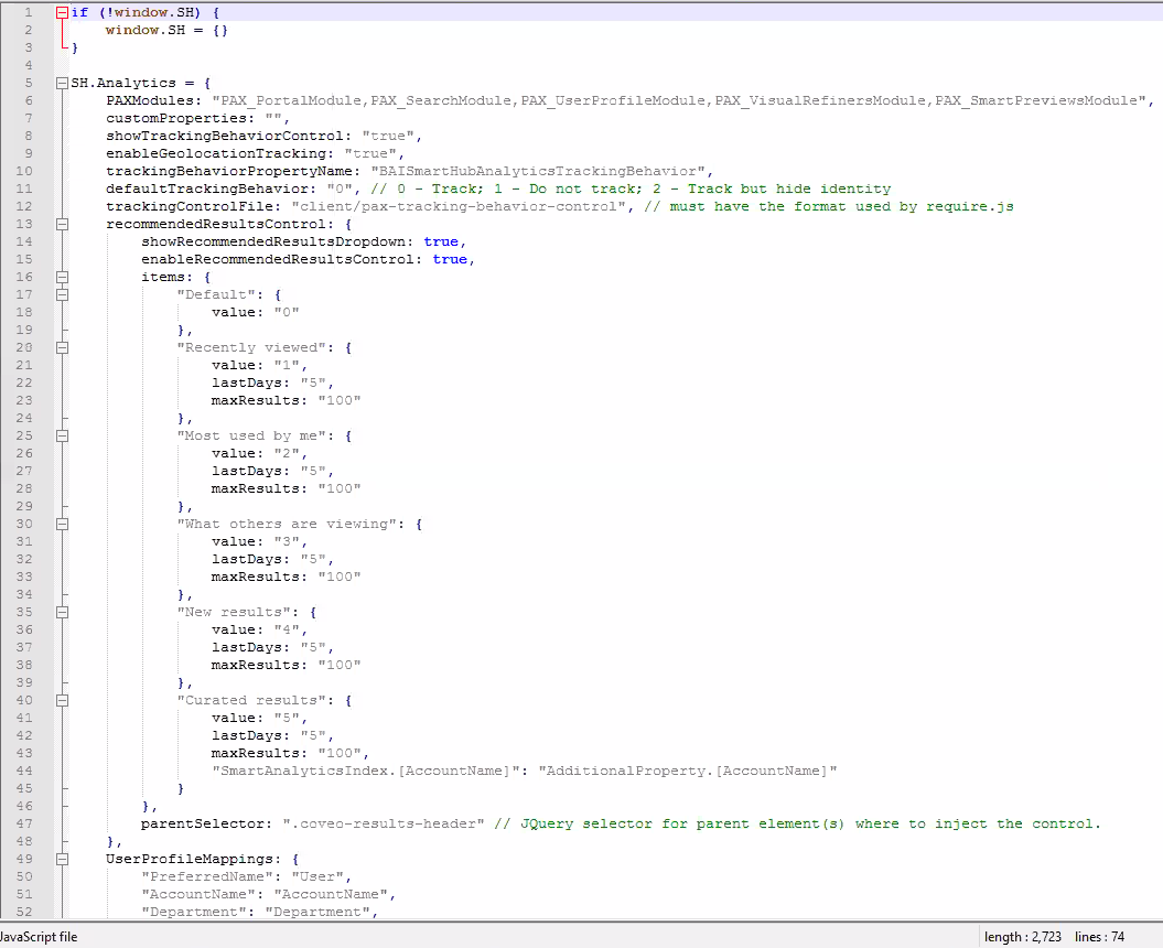 - If you want analytics to track data on your (search) Results page, use your custom Results settings file: ResultsCopyCustomSettings.js. This is the natural choice.