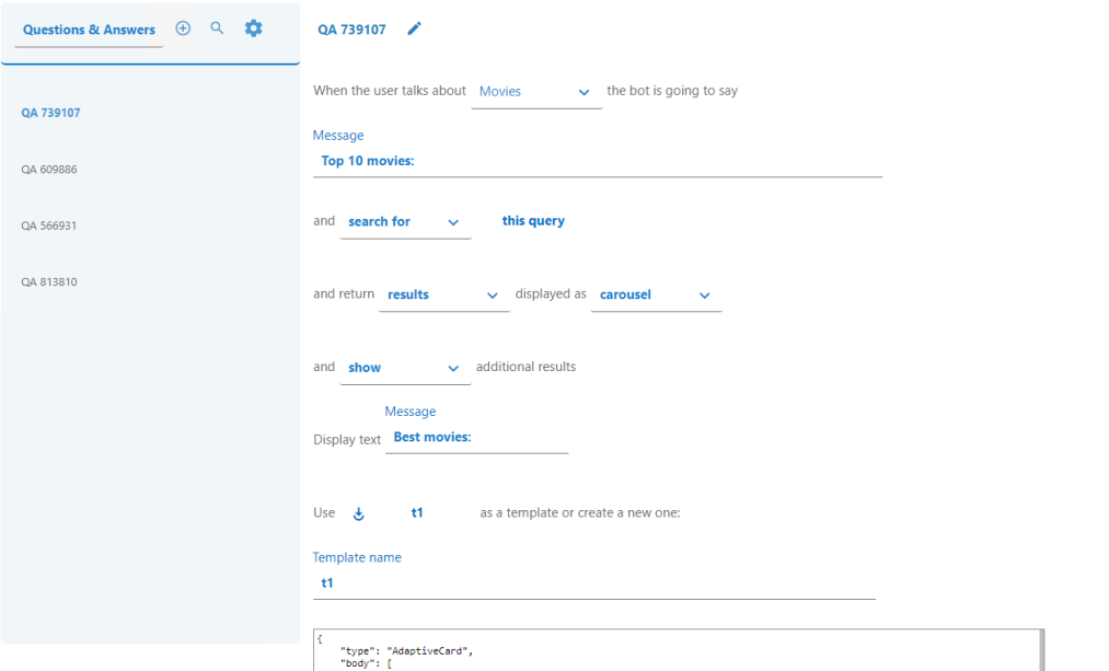 - Adaptive Cards JSON: The JSON template used to render the bot results