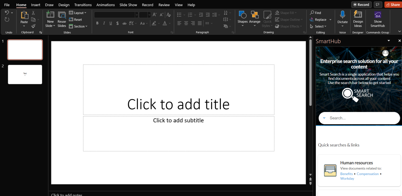 Users can enable SmartHub in their PowerPoint instance by going to Home > Add-ins > More Add ins > Admin managed and add "SmartHub".