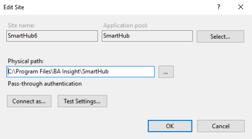 Click Edit Site > Basic Settings to instruct IIS to use the clean SmartHub 6.x unzipped directory path.