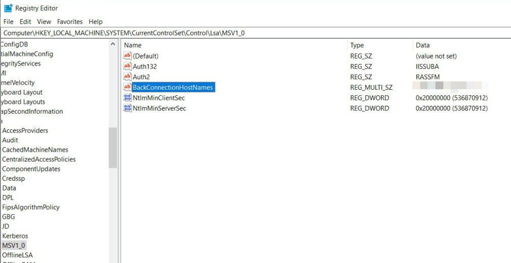 The entry Lsa\MSV1_0 already exists. You simply need to add a new entry: BackConnectionHostNames