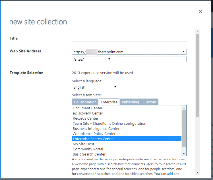 - Site url: Enter the URL for your SharePoint Online Search Center, which is a site collection created with a SharePoint "Enterprise Search Center" template. You may receive an error when performing a query if you do not use a Search Center URL in this field.