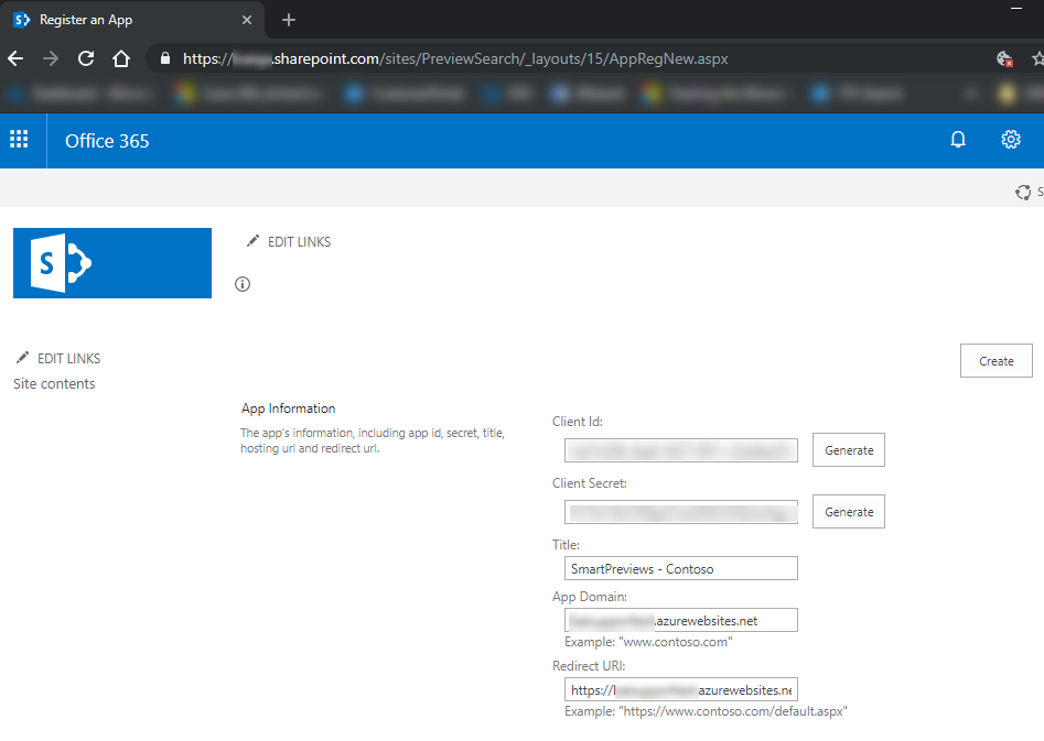 The steps below register a new SharePoint Online App, which you publish the Smart Preview App to, later in this guide.