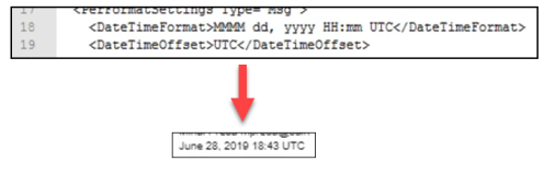<DateTimeFormat>parameter values in the ConversionEngine.config file are: MMMM dd, yyyy HH:mm UTC - An example of the parameter, its values, and the output is shown below