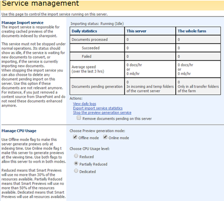 - The Smart Previews Web Administration Console - Central Administration page appears.