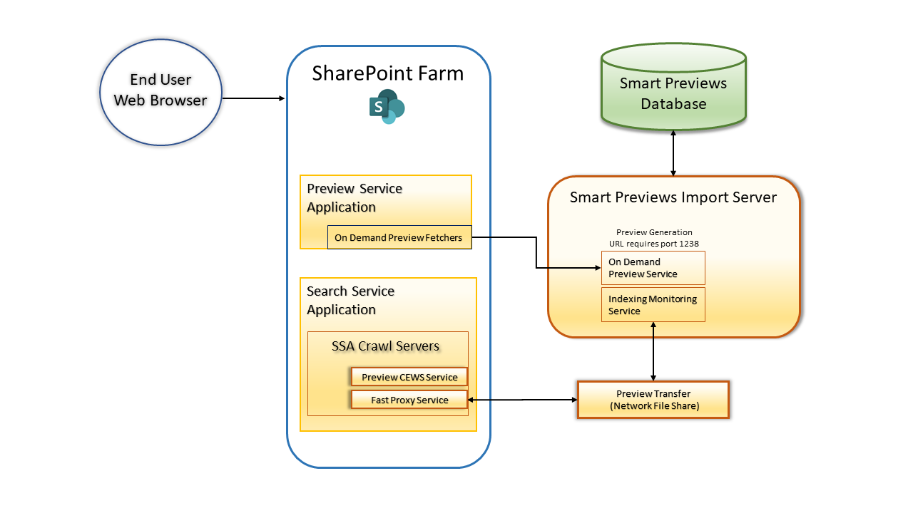 | Smart Previews SharePoint Monitoring Service | This is the service that monitors the Transfer Folder and moves data to the Smart Previews Import Server. |