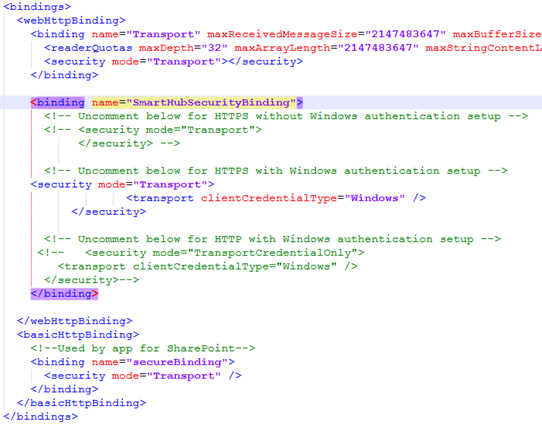 - Locate the system.serviceModel\bindings\webHttpBinding section and change the SmartHubSecurityBinding by uncommenting the SmartHub security section and commenting the other two sections.