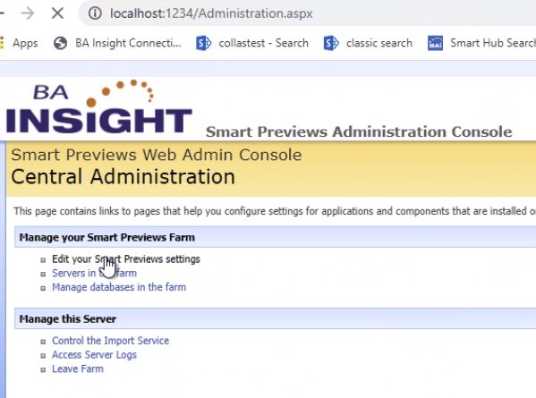 - Navigate to the Configure page for Smart Previews Web Resources: https://[SmartPreviewsWebResourcesAddress]/Pages/Configure.aspx