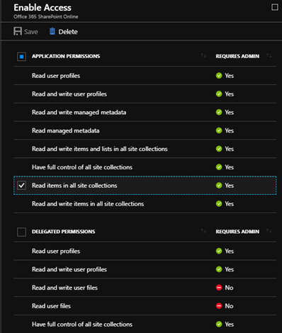 - Select Enable Access > APPLICATION PERMISSIONS: