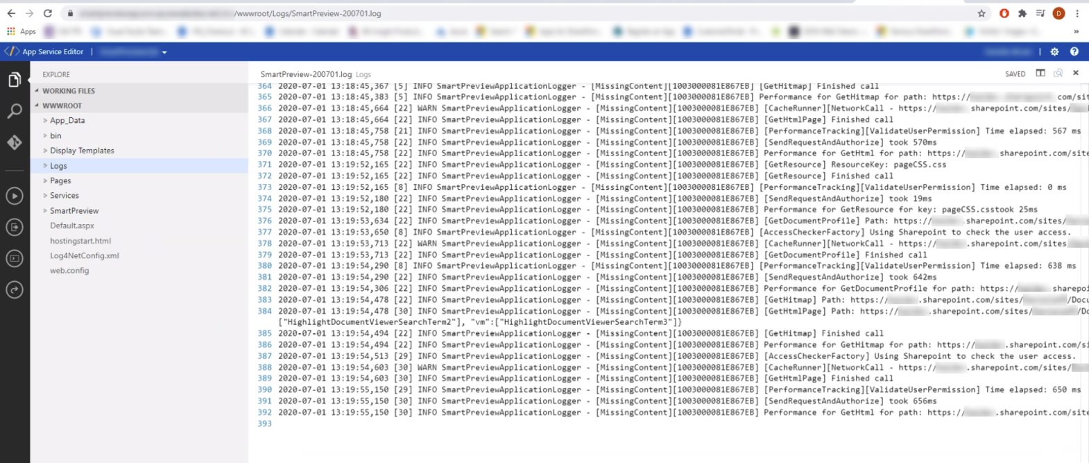 The Smart Previews for SharePoint Online stores its logs in the Azure Portal in the WWWROOT folder.