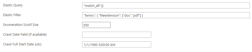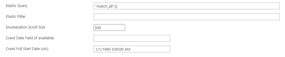 - In the Elastic Query field, enter a valid Elastic query which will serve as the bases for what data from the index is crawled. For example,