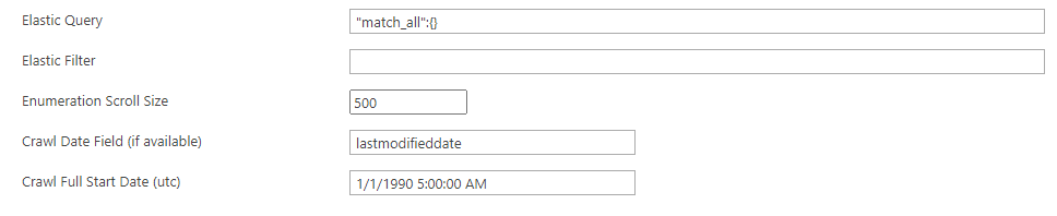 - In the Crawl Date Field (if available) field, enter the date-time field for your Elastic index. If the Elastic Index has a date-time field which represents the modification date/time of each item within the index, then incremental crawls are possible. Without a date-time field, you can run only Full Crawls.