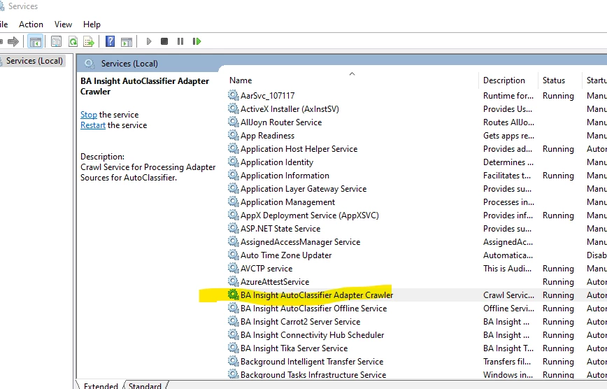 If you have issues with your AutoClassifier adapter, confirm the crawl adapter service is running