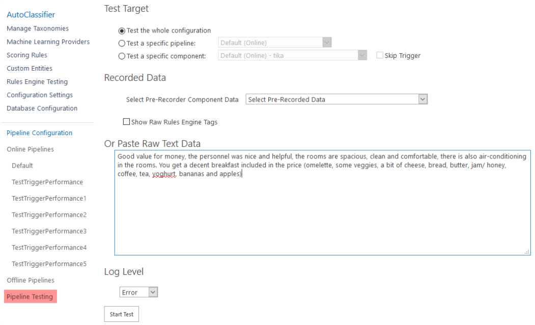 To see a sample of which tags you receive based on ML classification, go to the Pipeline Testing page, highlighted below.