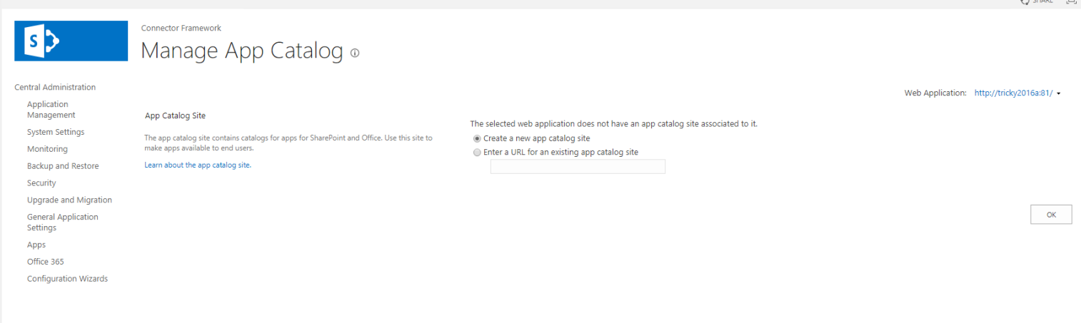 - If the web application does not have an App Catalog, create a new App Catalog or link to an existing App Catalog site.