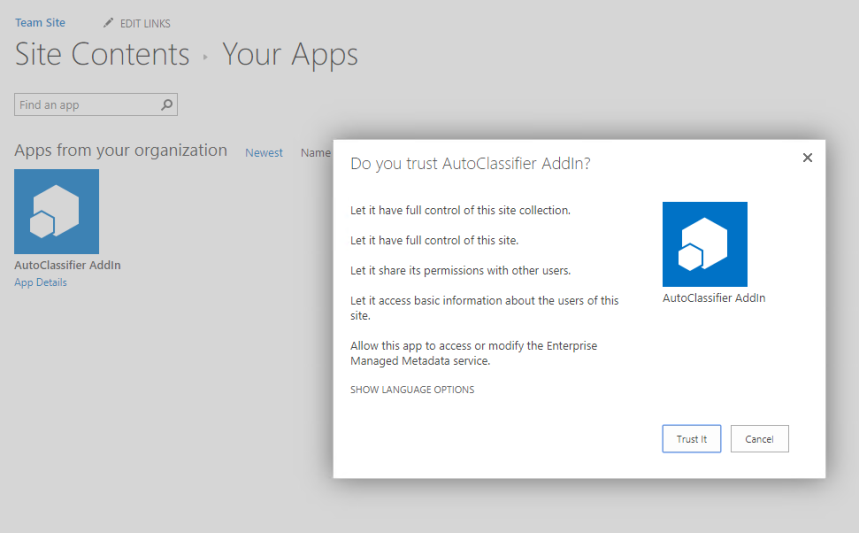 - When adding the AutoClassifier app you may be presented with a dialog similar to the one shown below:
